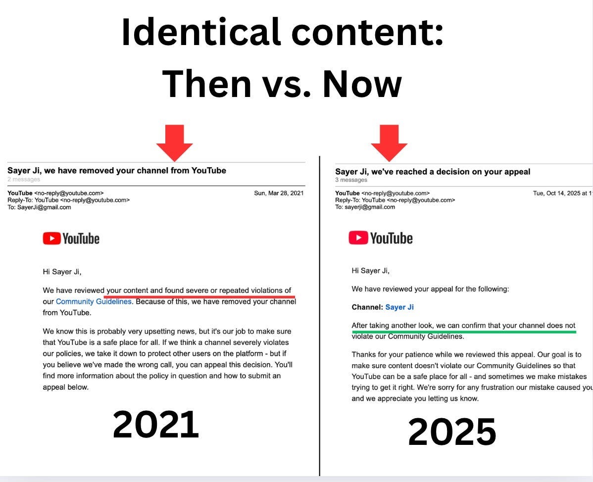YouTube complied, banning Rizza and me without citing specific policy violations. Now YouTube acknowledges our content never breached any standards — a tacit admission that their censorship was politically induced, not rule-based.