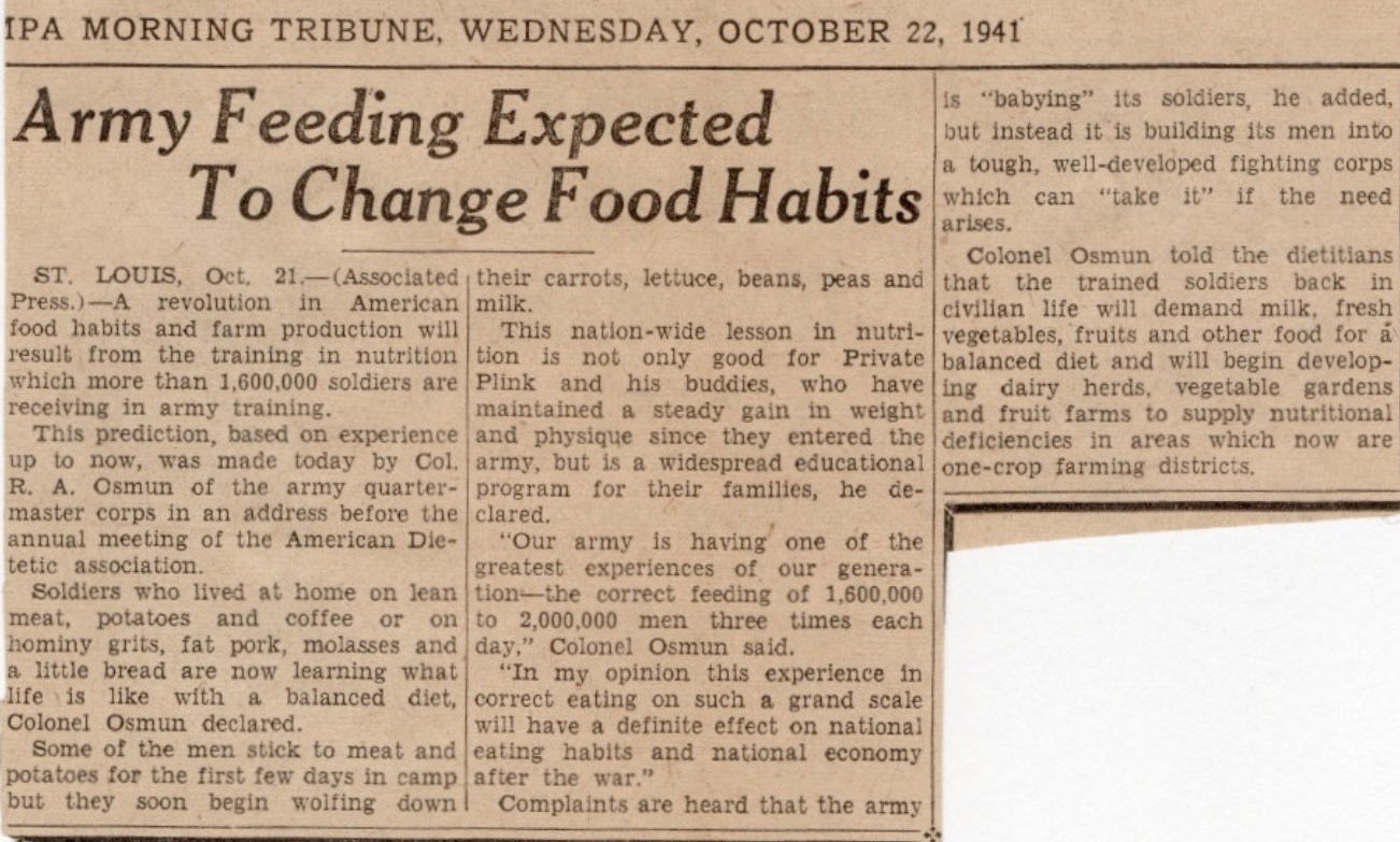 This shift, led by the Army Quartermaster Corps, was based on one simple observation: when young men were fed nutrient-dense food, they grew stronger, healthier, and more physically capable. At boot camp, soldiers were wolfing down “meat, carrots, lettuce, beans, peas and milk,” said Col. R.A. Osmun of the Army Quartermaster Corps. in a 1941 address before the annual meeting of the American Dietetic Association (ADA).
