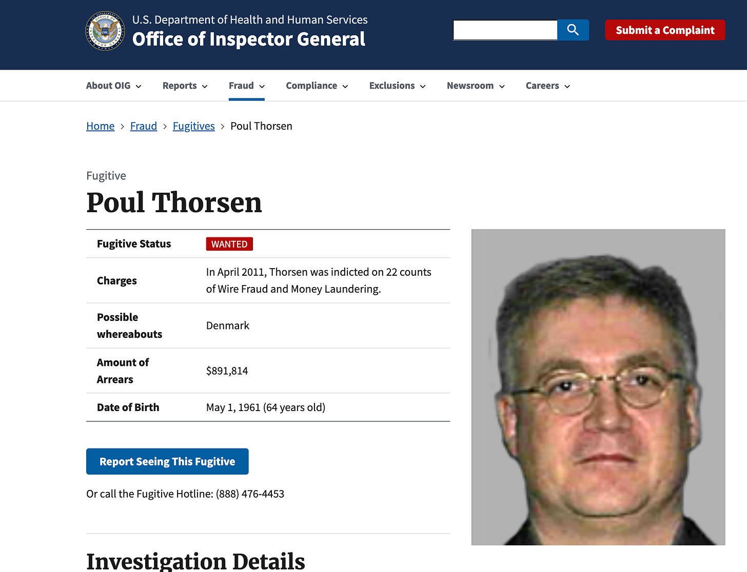 You might recall that Poul Thorsen is wanted by the Office of the Inspector General of HHS for stealing over a million dollars from American taxpayers. Thorsen has been on the lam for fourteen years.