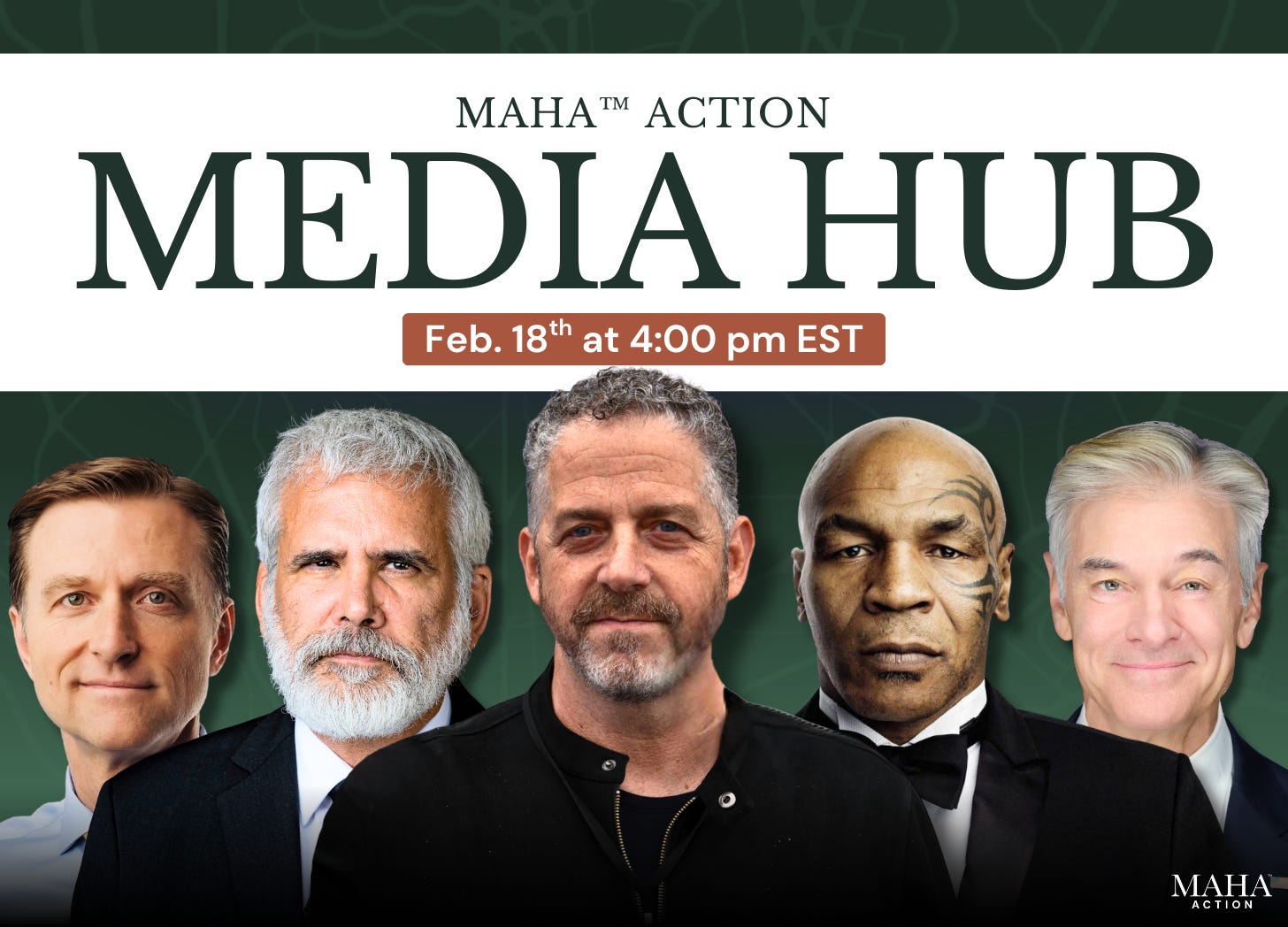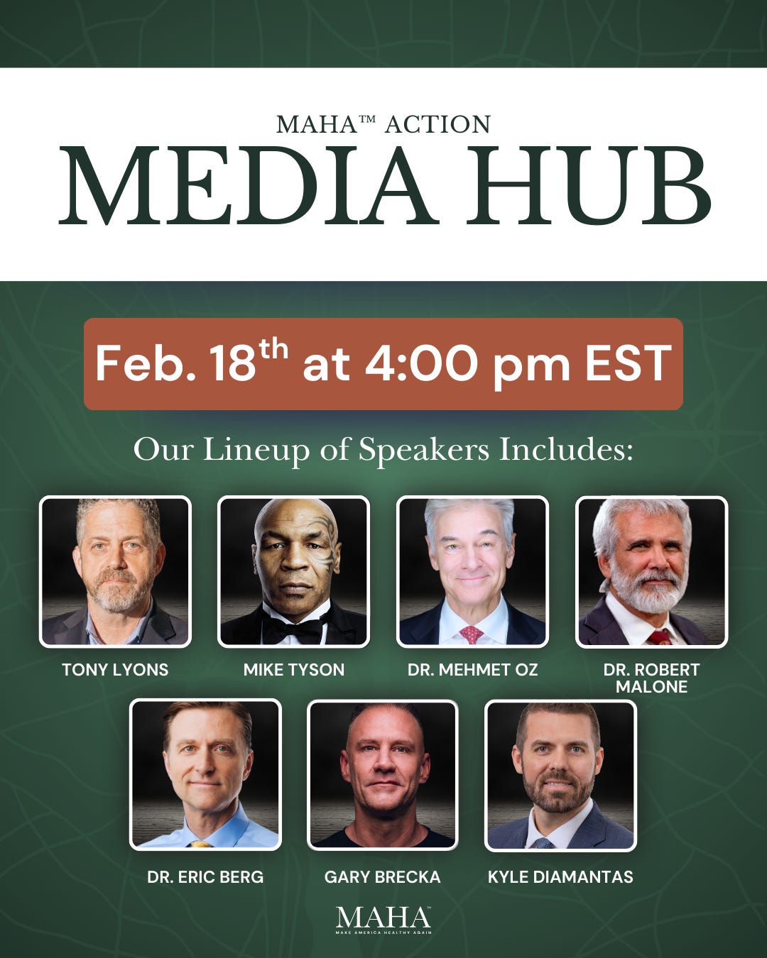 Please join us on Wednesday, February 18, from 4pm - 5pm Eastern, for the MAHA Action Media Hub, featuring some of the biggest stars in the MAHA universe delivering resonant messages for all Americans.