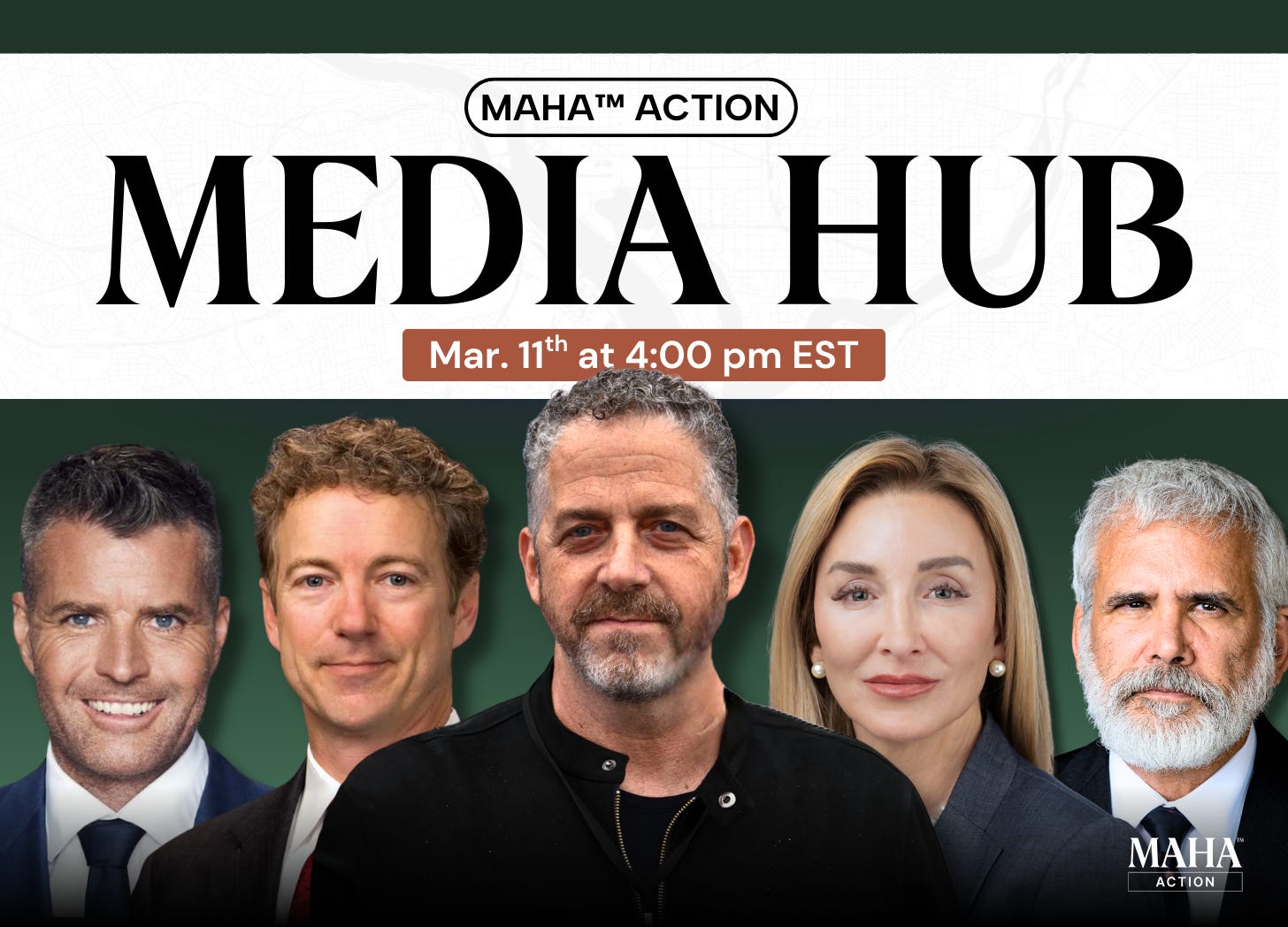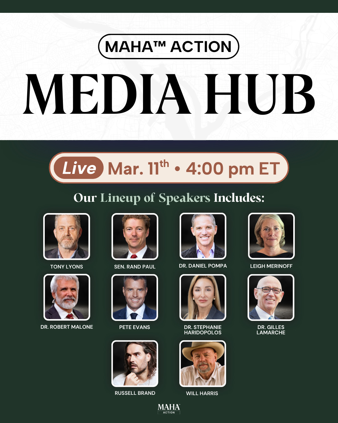 Please join us today, March 11, from 4pm - 5pm Eastern, for the MAHA Action Media Hub, featuring some of the most influential voices of the movement.