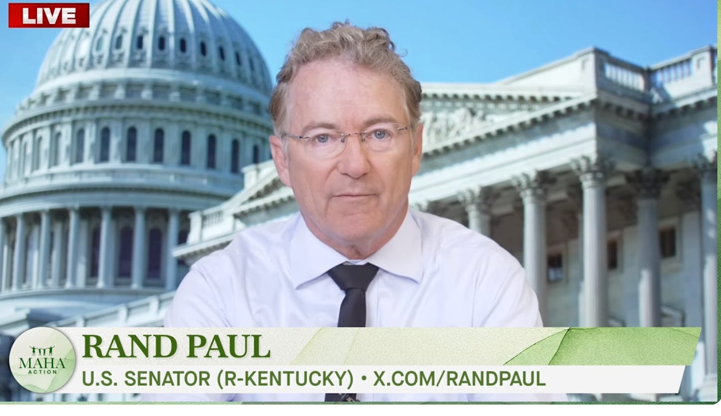 Keeping his cards close to the vest, Senator Paul told MAHA Media Hub listeners that HHS Secretary Kennedy is helping him access documents related to Covid that had all but disappeared. Tantalizingly, Paul spoke of documents released by the State Department that confirm that the three people developing a vaccine at the Wuhan Lab all got sick in November of 2019. And, he says, three months after the Covid vaccine was put into use in China, its inventor, a general in the People’s Liberation Army, died — cause of death unknown.