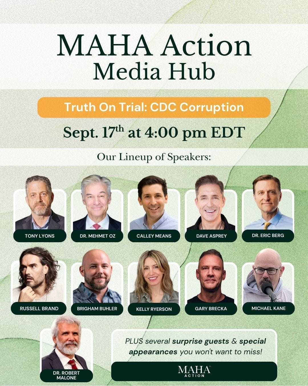 Today, at 4pm Eastern/1pm Pacific, MAHA Action hosts its 7th Media Hub: Truth on Trial - The CDC Corruption Exposed.
