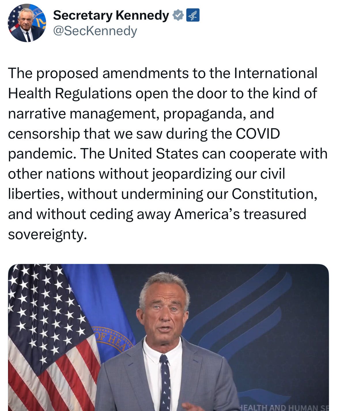 Kennedy’s position is based on a robust defense of the constitutional rights of Americans that the WHO would otherwise seek to abrogate. The intention of the WHO is to fully globalize the kinds of restrictions that some states and countries saw during the COVID era. Kennedy sounded the alarm on this and pledged that this will never again be allowed to happen in the United States, and certainly not at the behest of unelected global bodies.