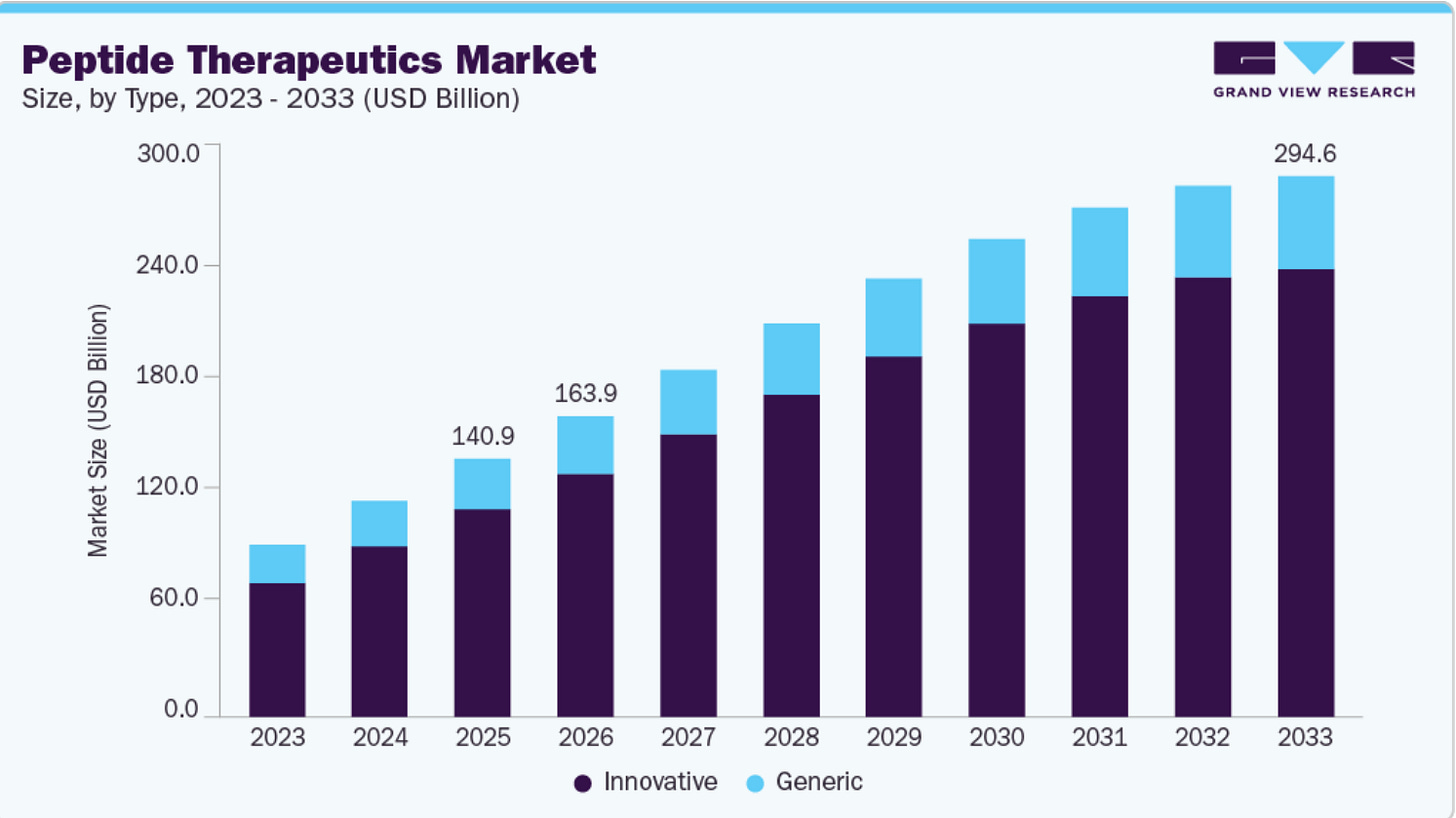 Peptides have become part of a much larger battle over access to preventive, out-of-pocket health care. This is no longer a niche market. By 2025, the global peptide therapeutics market was estimated at more than $140 billion, with projections reaching $294.58 billion by 2033.