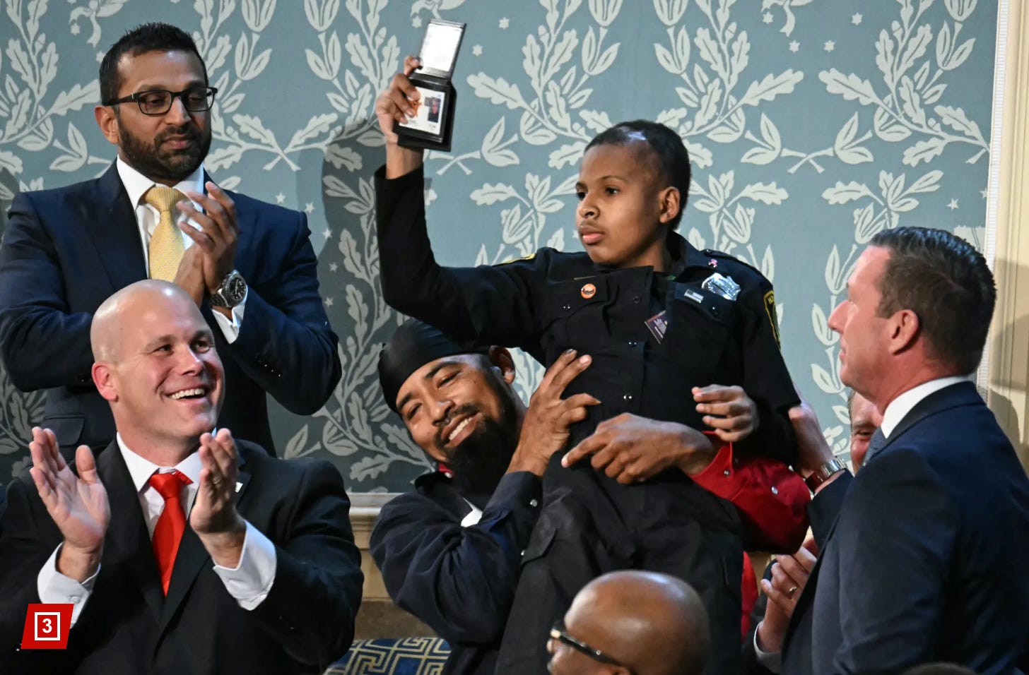 “Joining us in the gallery tonight is a young man who truly loves the police,” Trump began. Cameras found Daniels in the audience, his father lifted him onto his shoulders, and the audience erupted in applause