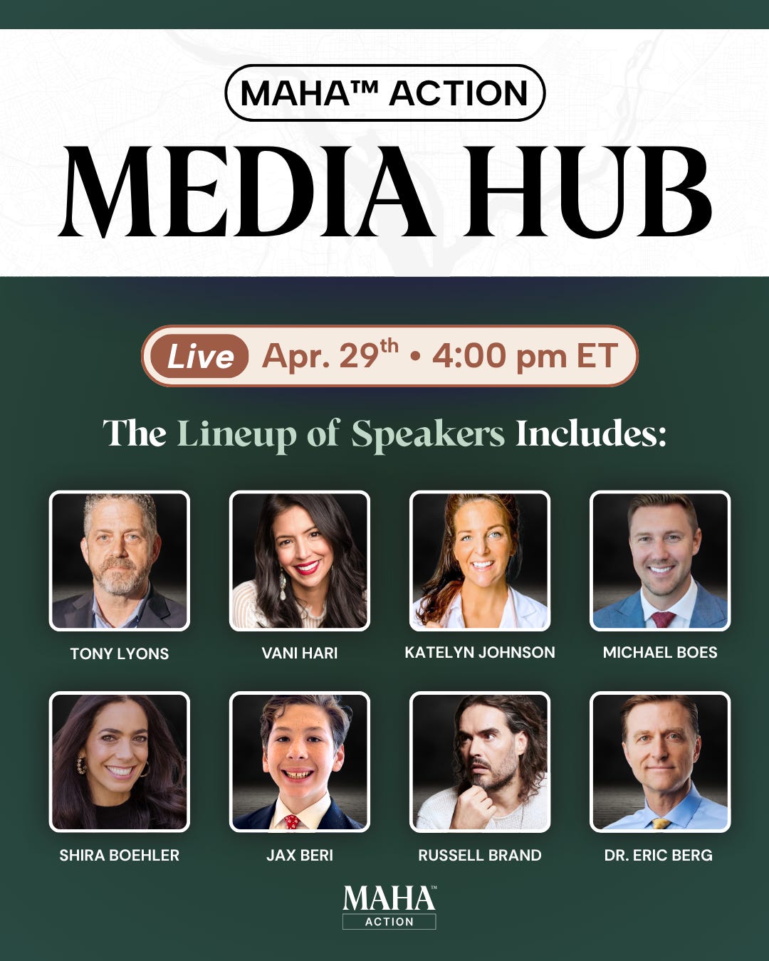 Please join us on April 29, from 4pm - 5pm Eastern, for the MAHA Action Media Hub, featuring the top minds and advocates from around the MAHA movement.