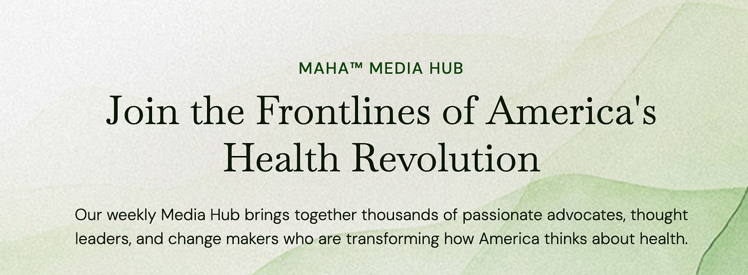 We at MAHA have powerful tools at our fingertips – the MAHA Media Hub calls; The MAHA Report on Substack; our incredible MAHA Institute round tables; the historic MAHA Summit; MAHA films, books, parties; our mailing list of over two million MAHA warriors; and, of course, our thousands of influencers with hundreds of millions of followers.