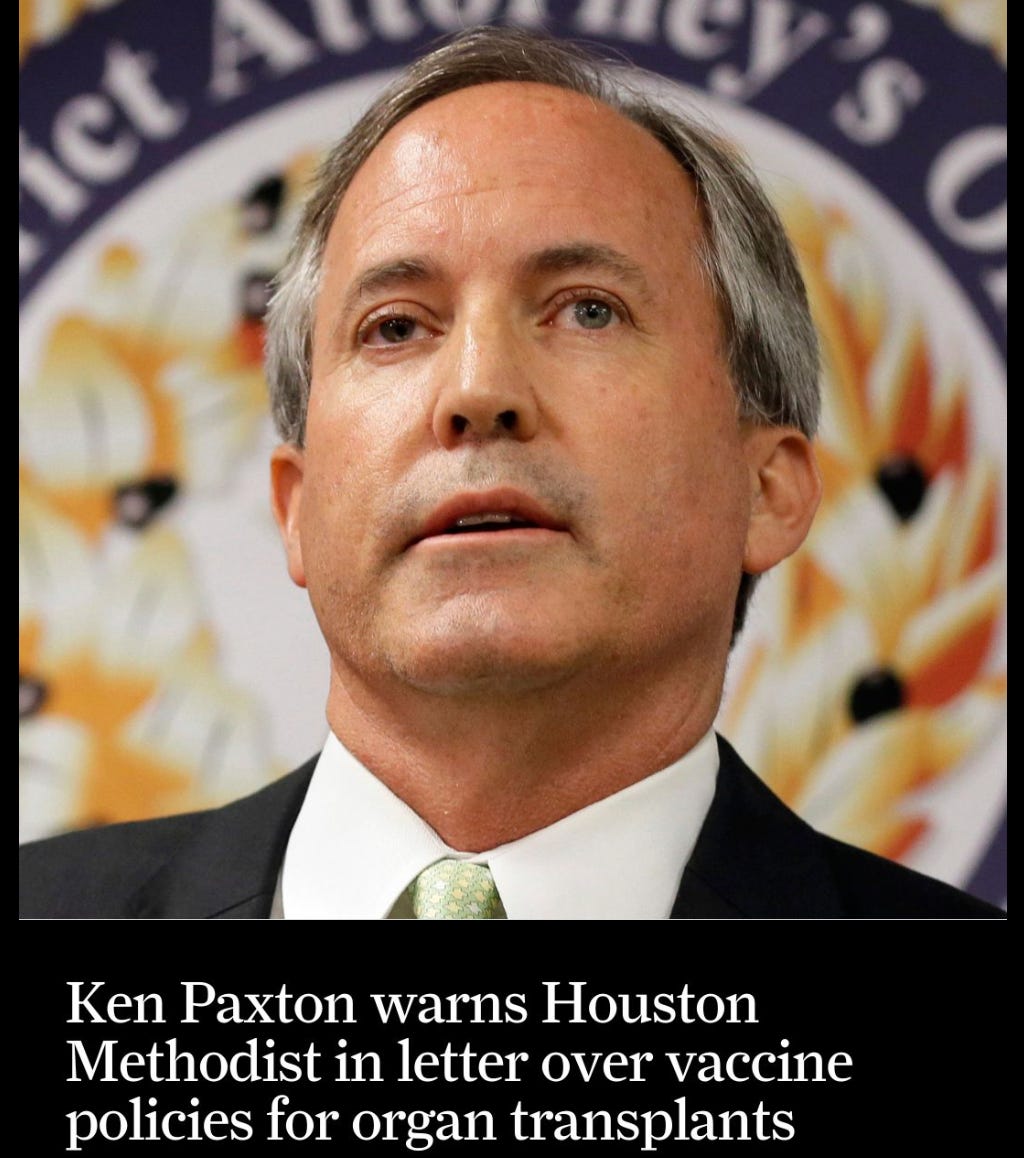 Texas Attorney General Ken Paxton issued a letter to Houston Methodist Hospital, warning that the state will launch an official investigation into claims that the hospital is mandating COVID-19 vaccinations for organ transplant patients, with refusal leading to denial of potentially life-saving treatment. According to Paxton, “Texas law prohibits healthcare providers from denying organ transplants or related services solely because of a patient’s decision to not receive a COVID-19 or other vaccination.”