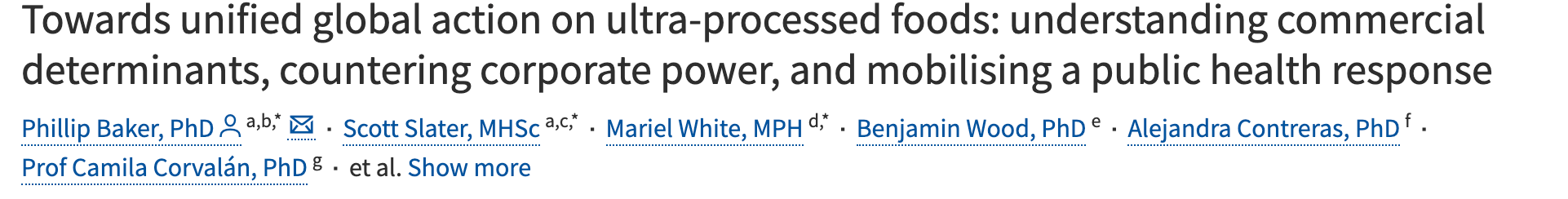 The third paper is tellingly titled, “Towards unified global action on ultra-processed foods: understanding commercial determinants, countering corporate power, and mobilizing a public health response.” This analysis likens the sluggish policy response to the harmful impacts of UPFs on global public health to tobacco control efforts decades ago. The paper presents the global food crisis in three stages: 1) the UPF industry is a key driver of the problem due to the high profitability of UPFs, 2) protecting the public is stymied by the UPF industry’s coordinated corporate political activities to counter opposition and block regulation, and 3) possible strategies to counter this UPF monopolization of food supplies and distribution systems.