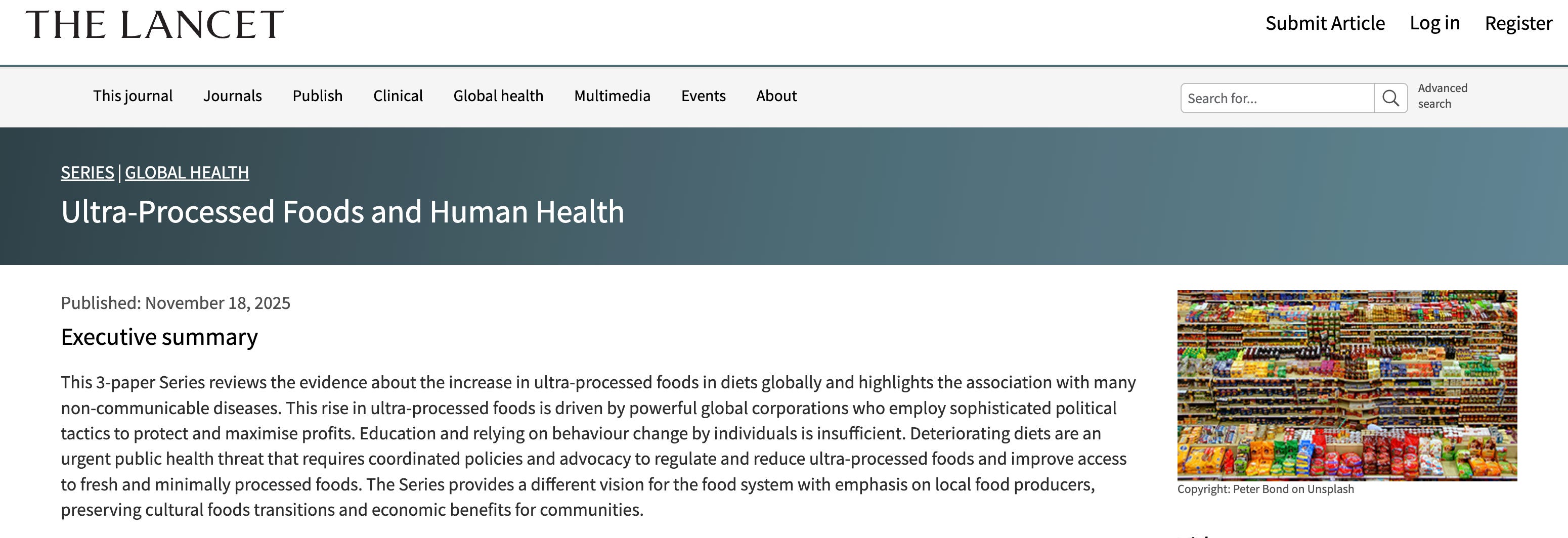 The second paper in The Lancet series presents a set of policies designed to reverse the unhealthy dietary transition from traditional to ultra-processed diets. Noting that policies to date have focused on reducing consumption of unhealthy foods, the paper identifies four “food policy domains” that motivate UPF production, marketing and consumption, and explores policy options for each to target large-scale food system areas in greatest need of change. The domains studied include “UPF products, UPF food environments, UPF manufacturers, fast-food corporations, and supermarket corporations, retailers and food supply chains.” This study also explores policies to protect and incentivize dietary patterns based on fresh and minimally processed foods, especially for low-income households worldwide.