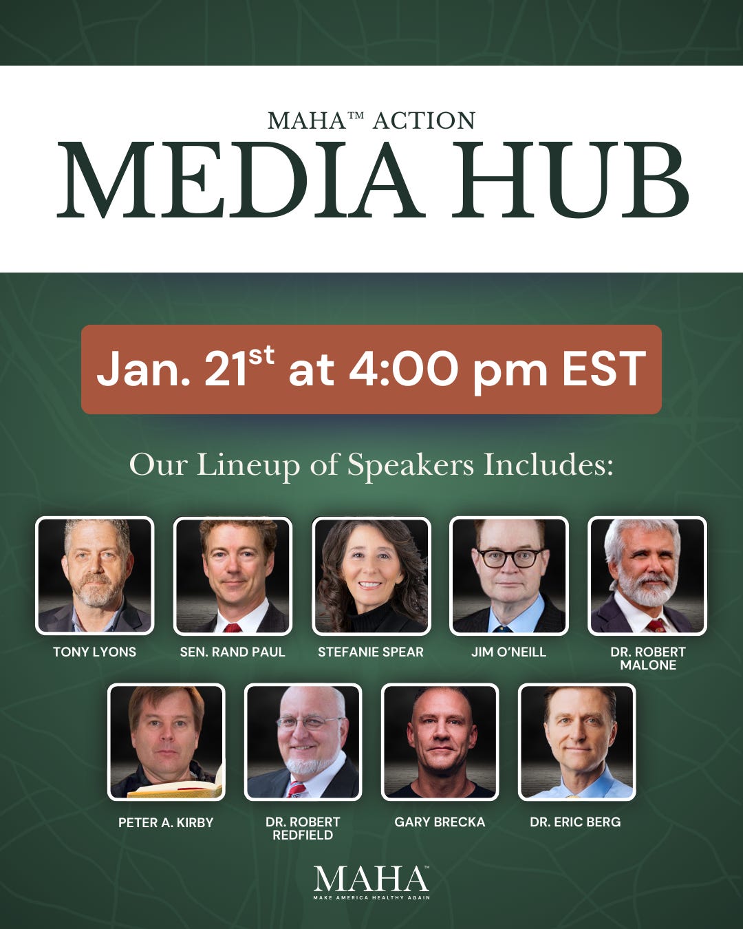 Please join us on Wednesday, January 21, from 4pm - 5pm Eastern, for the MAHA Action Media Hub, featuring some of the most prominent voices from the MAHA movement. These men and women are working tirelessly to change both perceptions and realities about health, nutrition and medicine.