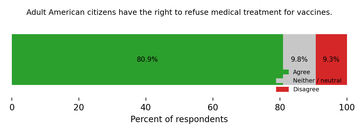 Several questions dealt with the issue of parental rights to shield children from over-medicalization. 65.7% of adults believe that parents have the right to refuse vaccination on behalf of their children and dependents.