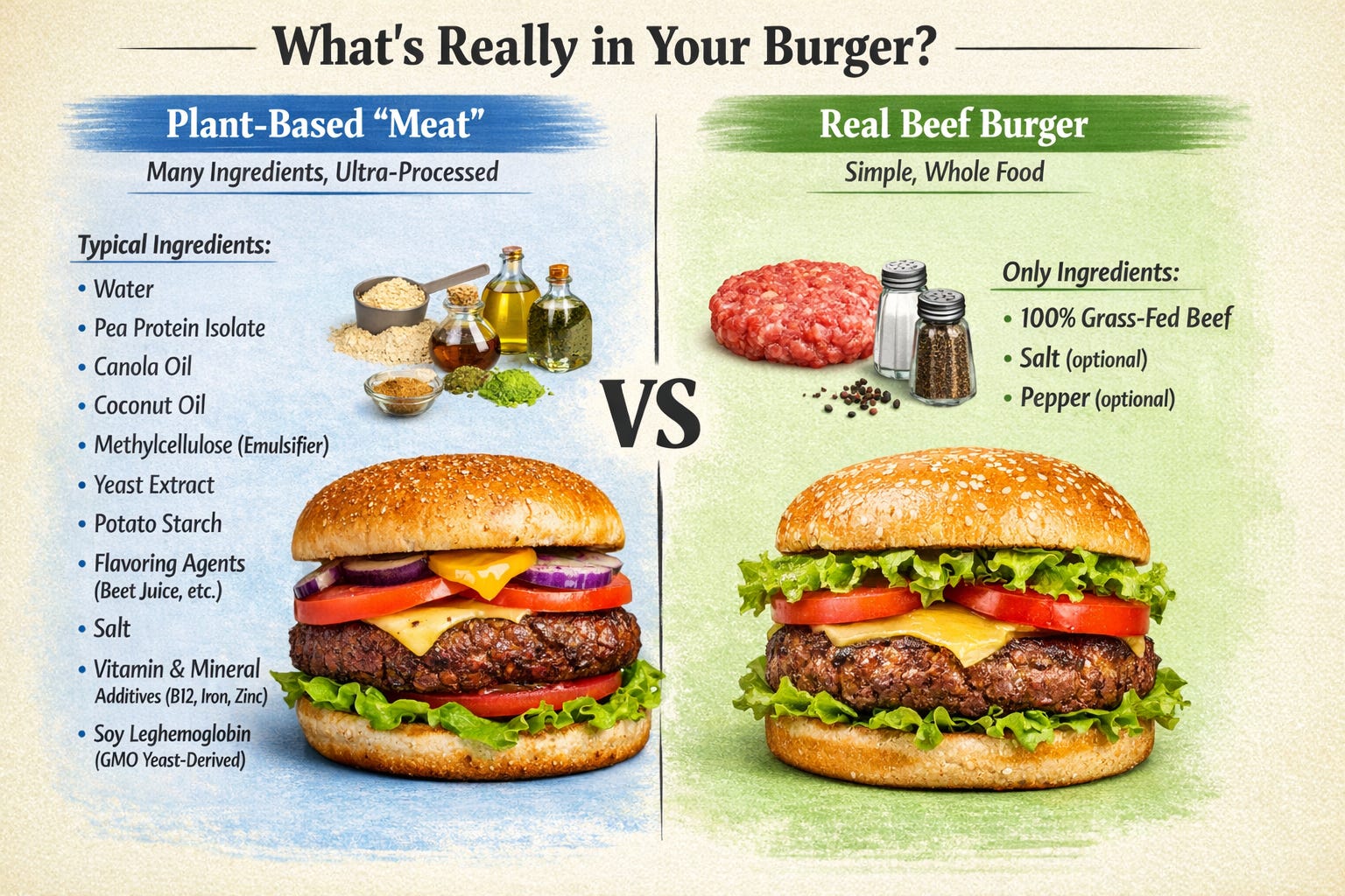 Impossible™ burgers contain genetically engineered soy-based hemoglobin (fake blood) synthetic vitamins, and binders. Beyond Meat™ relies on pea protein isolates, canola oil, and methylcellulose, a synthetic laxative ingredient.