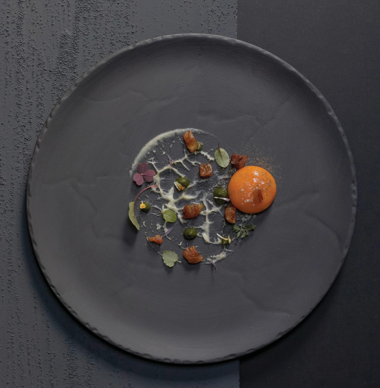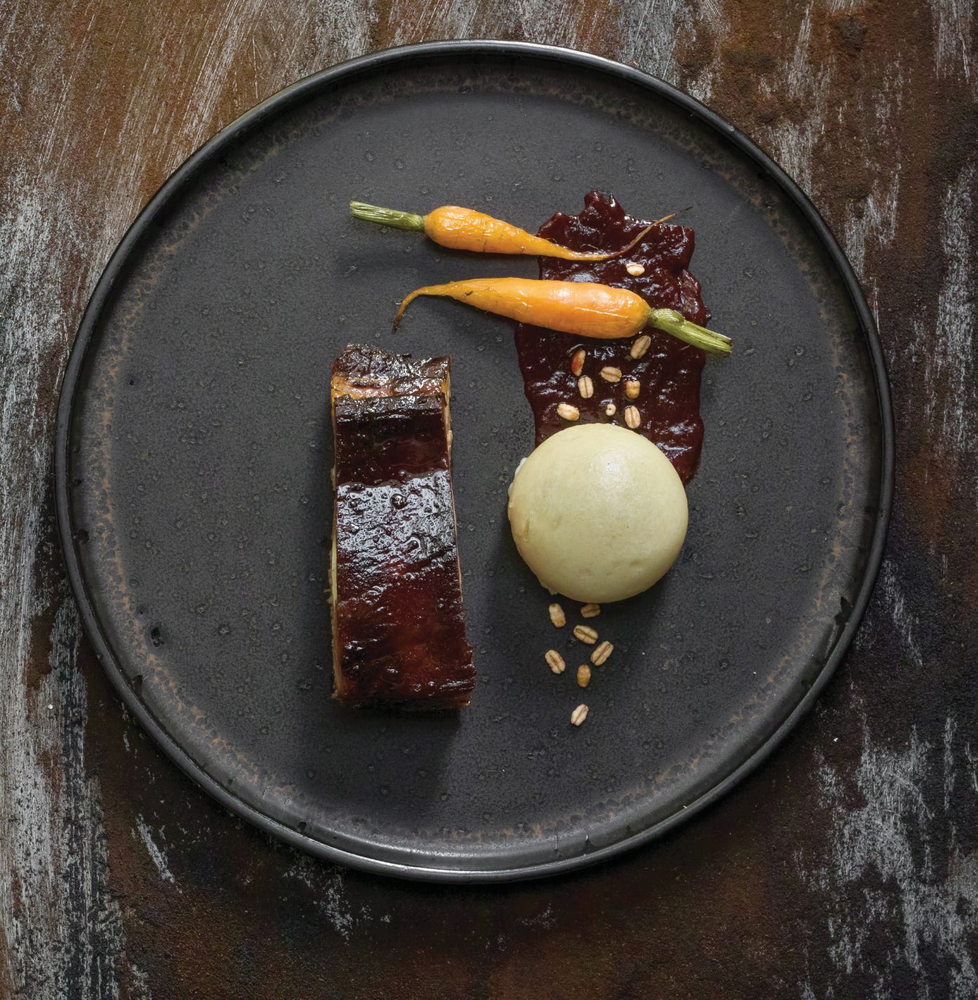 But Slovenia is not only coastline. Inland, JB’s restraint takes a different form. His dish, “Beef Ribs with Homemade Plum Jam, Steamed Bread, and Baby Carrots,” reflects the same respect for origin, but in a deeper register. The quality of the meat matters first. For JB, what the animal was fed, and how it lived, matters as much as its taste.