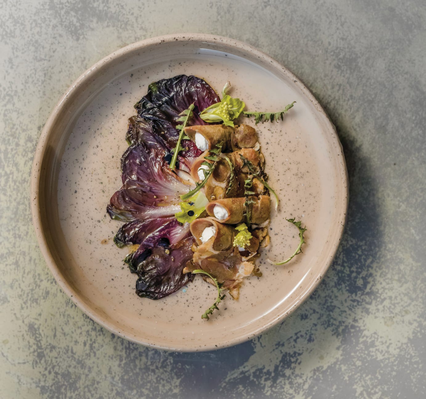 That childhood memory finds its fullest expression in “Egg Yolks and Cracklings with Parsley Root and Lovage Purées,” a dish rooted in the simplest comfort food: eggs fried in pork cracklings. At JB’s table, it becomes a reverent ritual, hot oil poured over yolk, bread ready for dipping – proof that traditional fats and traditional techniques can be both deeply nourishing and deeply refined.