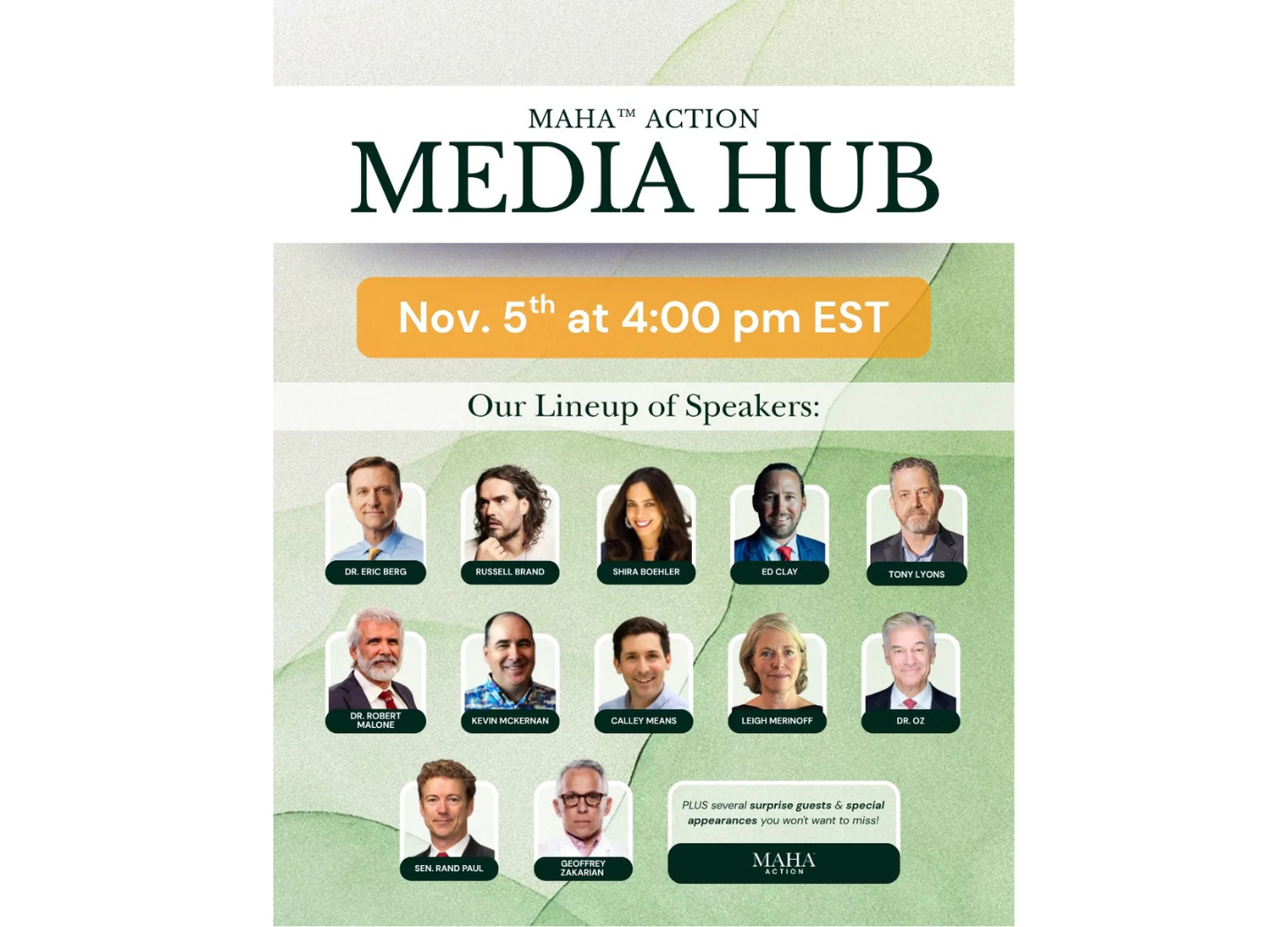 Wednesday’s program features MAHA Action president and host, Tony Lyons; nutrition expert, Dr. Eric Berg; genomics researcher and DNA sequencing expert, Kevin McKernan; Republican U.S. Senator from Kentucky and ophthalmologist, Dr. Rand Paul; health freedom leader and stem cell therapy pioneer, Ed Clay; physician, inventor, scientist, and author, Dr. Robert Malone; HHS special advisor and prolific MAHA advocate, Calley Means; biodynamic farmer, herbalist, and MAHA activist, Leigh Merinoff; comedian, podcast host, and MAHA advocate, Russell Brand; Administrator of the Centers for Medicare & Medicaid Services, Dr. Methmet Oz; Co-Founder and Chairman of Power Analytics Global, Keith Barksdale; author of One Scan Saved My Life, Shira Boehler; and celebrity chef, Geoffrey Zakarian.