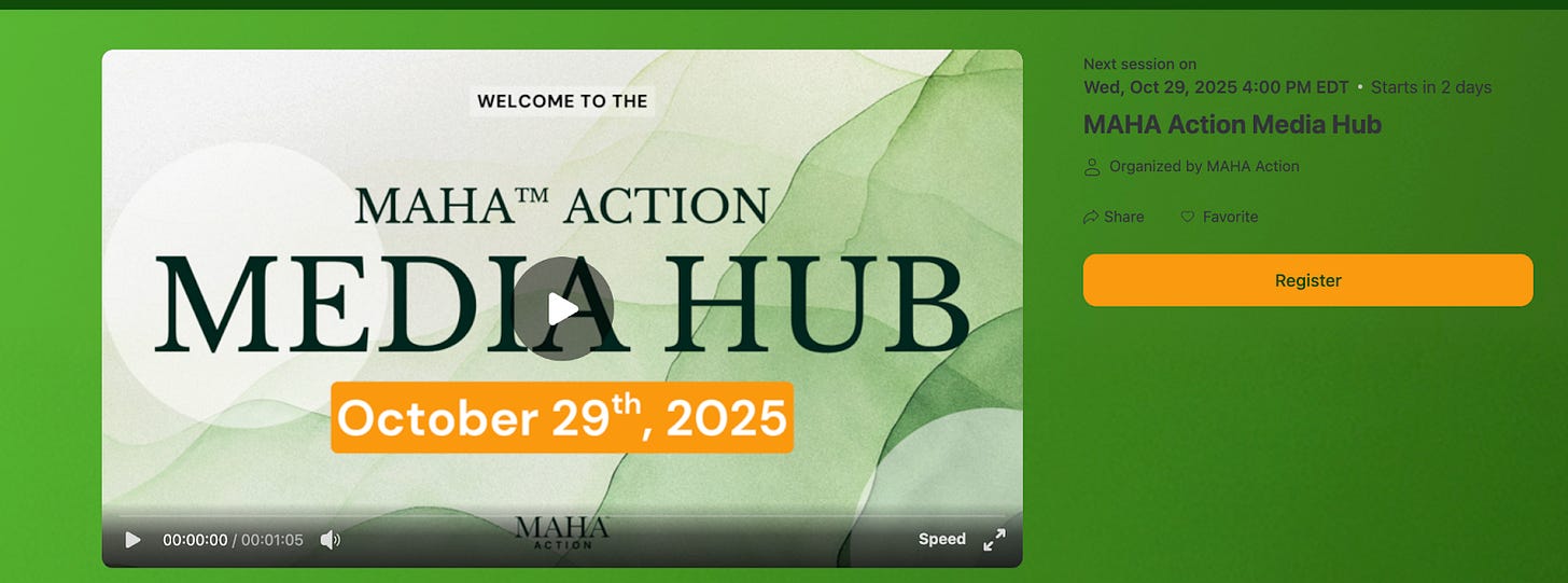 Please join us on Wednesday, November 5, from 4pm - 5:15pm Eastern, for another episode of the MAHA Action’s weekly media hub!