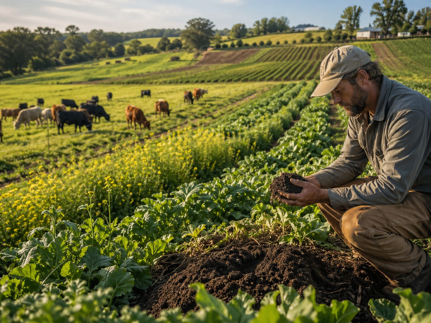 Regenerative agriculture means working in sync with nature, using practices like managed grazing, manure, compost, cover crops, and crop rotation to rebuild soil health. Healthier soil helps produce stronger, more nutrient-dense crops. It also helps those crops use water more effectively, while reducing dependence on costly and toxic inputs like synthetic fertilizers, herbicides, and pesticides.