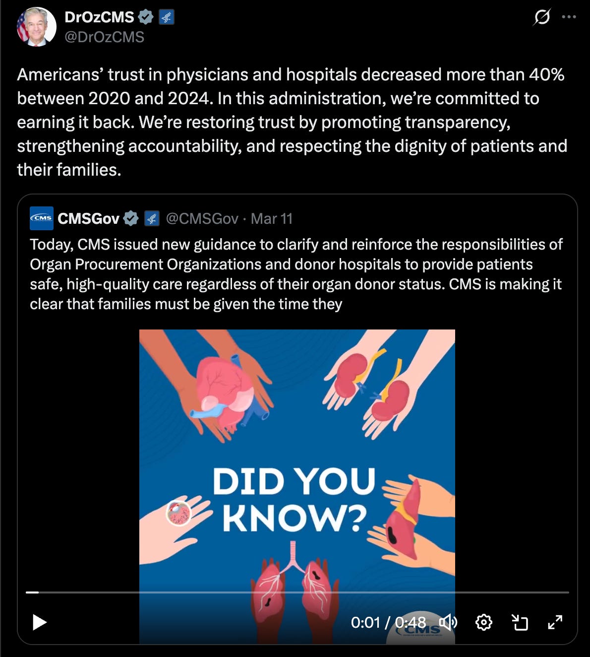 “Americans’ trust in physicians and hospitals decreased more than 40% between 2020 and 2024,” noted CMS Administrator Dr. Mehmet Oz. “In this administration, we’re committed to earning it back. We’re restoring trust by promoting transparency, strengthening accountability, and respecting the dignity of patients and their families.”