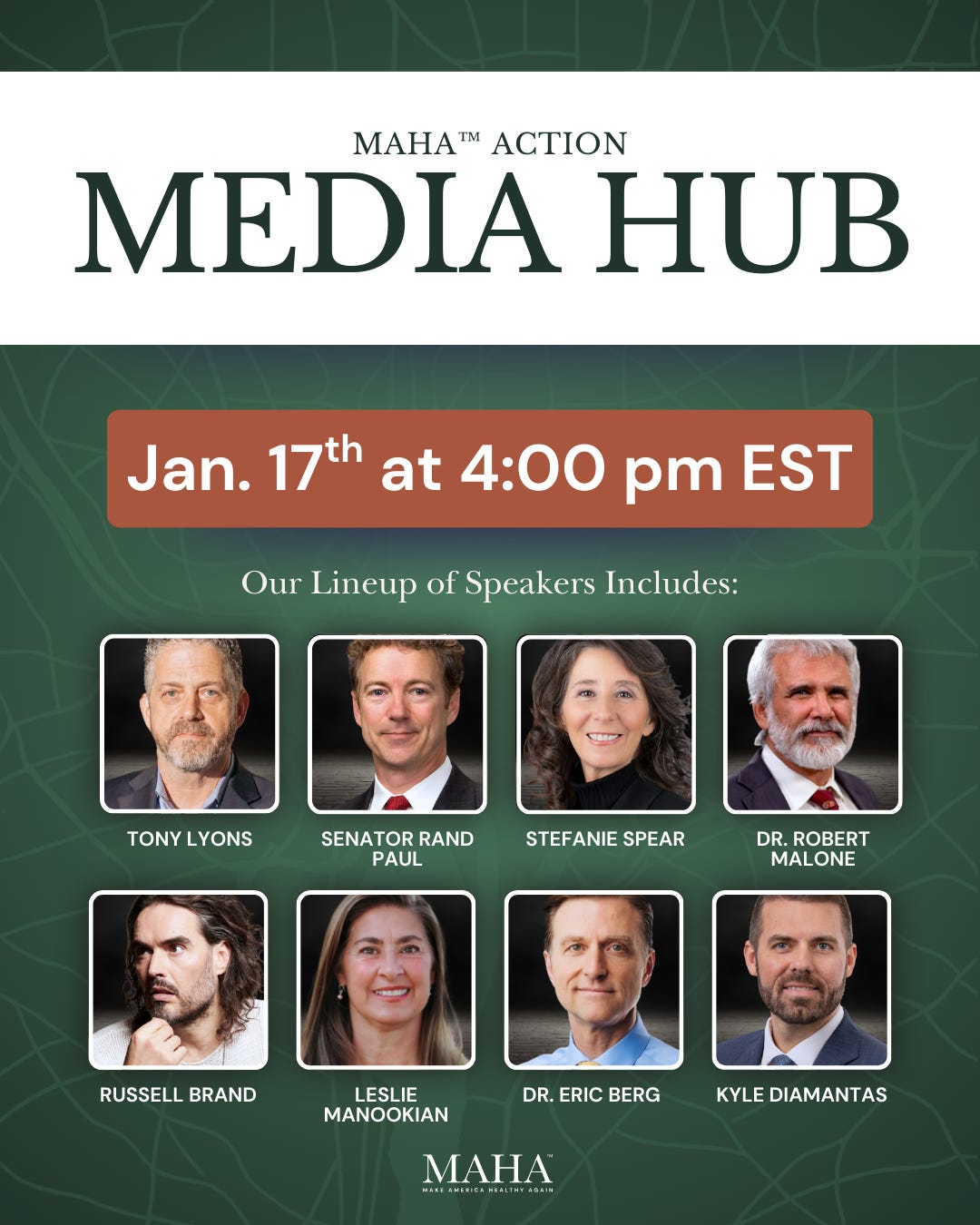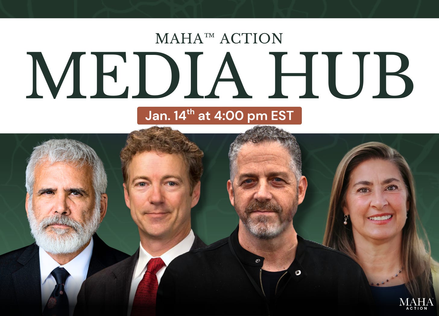 Please join us on Wednesday, January 14, from 4pm - 5pm Eastern, for the MAHA Action Media Hub, featuring leaders of the MAHA movement who are on the front lines, fighting to make our lives healthier.