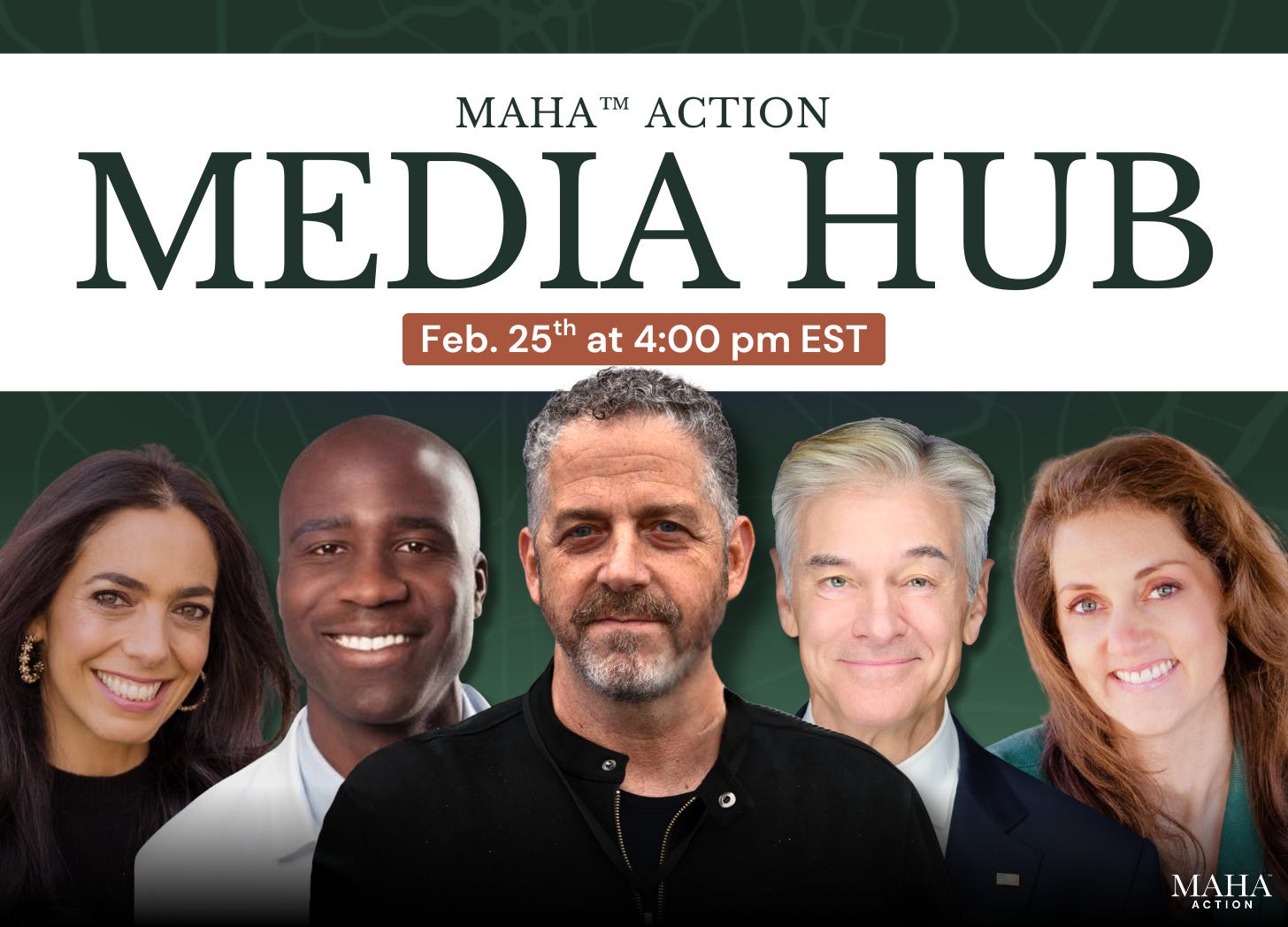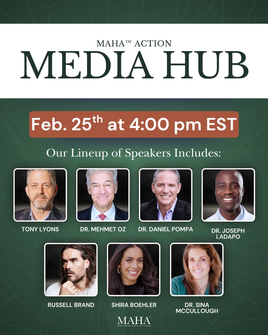 Please join us on Wednesday, February 25, from 4pm - 5pm Eastern, for the MAHA Action Media Hub, featuring some of the most prolific leaders of the national MAHA movement.
