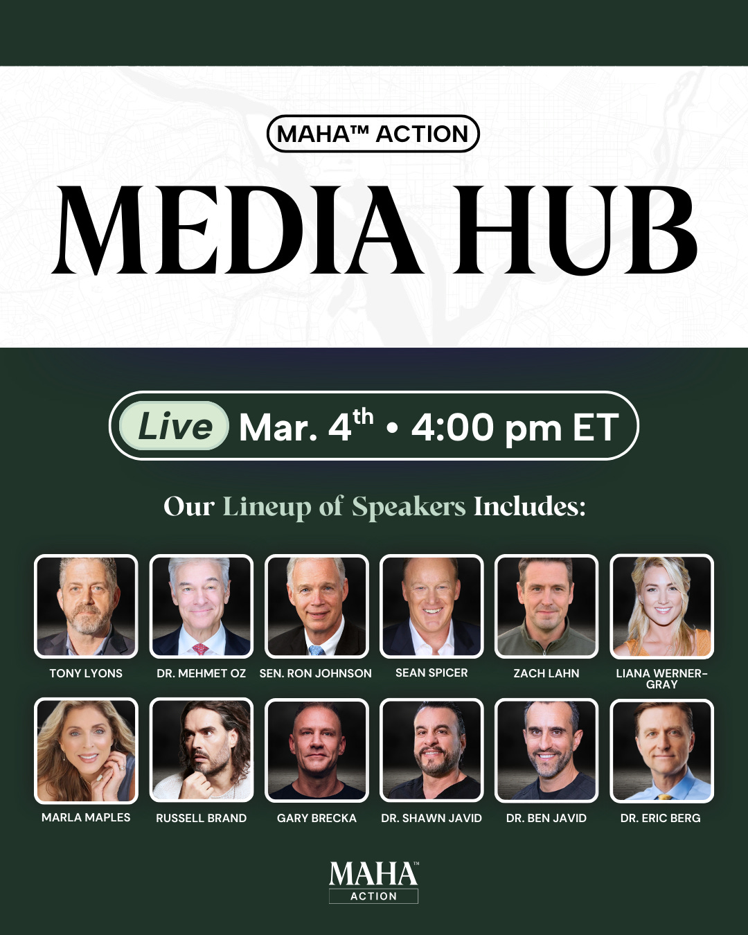 The program features Tony Lyons, MAHA Action president and host; Zach Lahn, Republican candidate for Governor of Iowa; Gary Brecka, human biologist; Sean Spicer, host of the Sean Spicer Show; Russell Brand, comedian, podcast host, and consciousness explorer; Dr. Mehmet Oz , Administrator for the Centers for Medicare and Medicaid Services; Dr. Eric Berg, “The Knowledge Doc”; Ron Johnson, U.S. Senator from Wisconsin; Liana Werner-Gray, nutritionist and bestselling author; Marla Maples, co-founder of The Global Wellness Forum and The Marla Maples Foundation; and Dr. Shawn and Dr. Ben Javid, biological dentists.