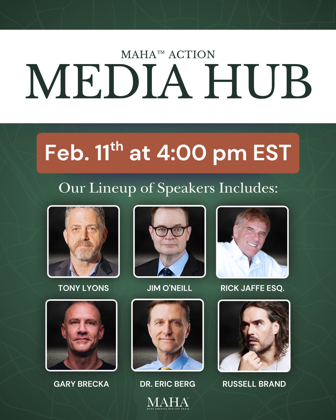 Please join us on Wednesday, February 11, from 4pm - 5pm Eastern, for the MAHA Action Media Hub, featuring the most informed and inspirational voices of the MAHA movement.