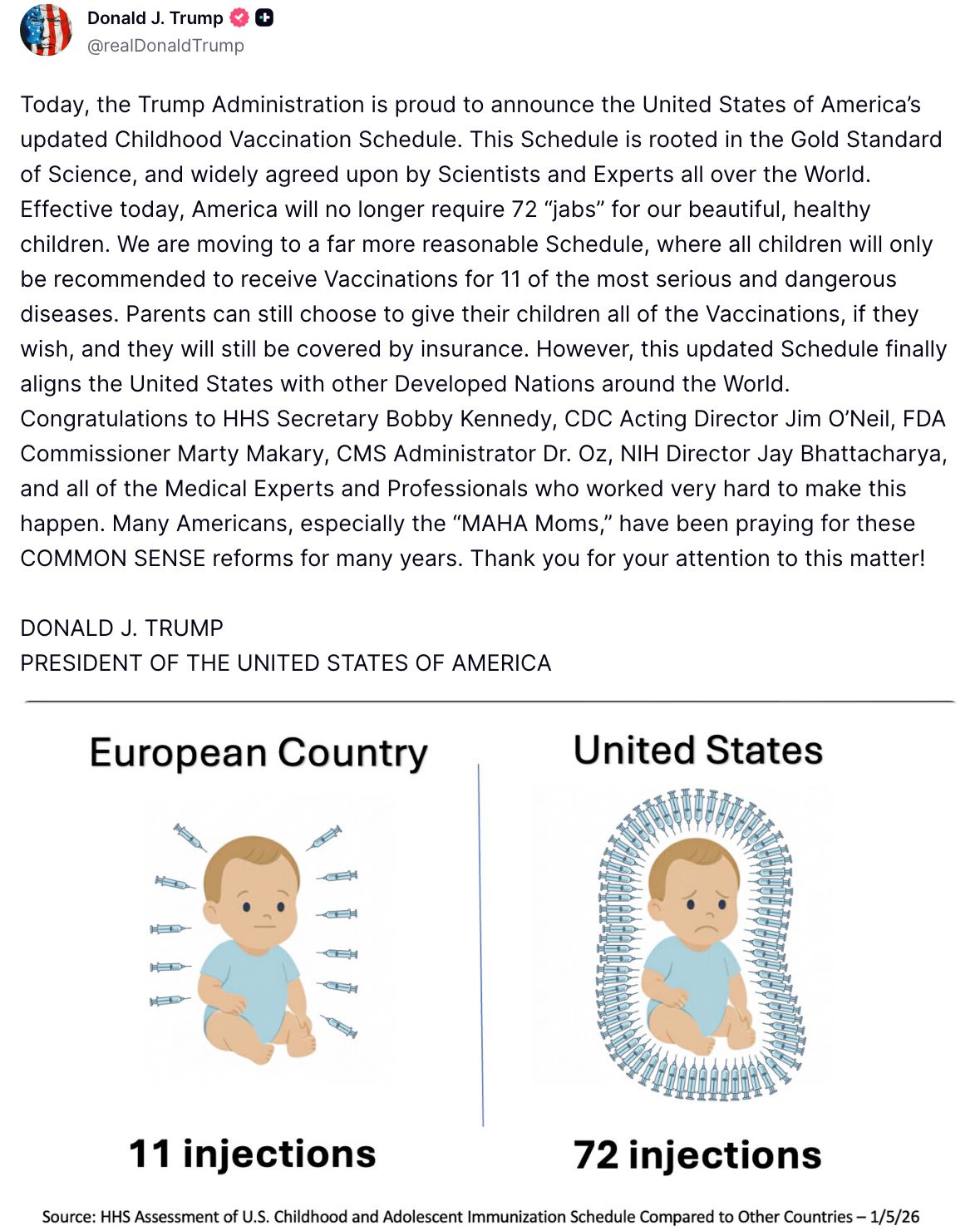 In a press release put out by the CDC, HHS Secretary Robert F. Kennedy Jr. said, “President Trump directed us to examine how other developed nations protect their children and to take action if they are doing better. After an exhaustive review of the evidence, we are aligning the U.S. childhood vaccine schedule with international consensus while strengthening transparency and informed consent. This decision protects children, respects families, and rebuilds trust in public health.”