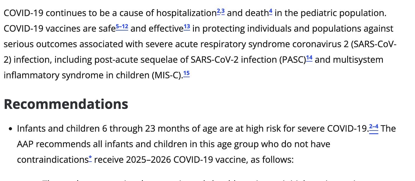 It is now understood that Covid poses a low risk to young people but the AAP’s policy is that you should roll the dice on your kid developing a serious cardiac condition because two physicians, paid for by Big Pharma, said you should.